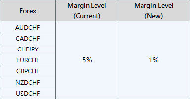 Please be aware that to keep open positions of CHF products and CHF Crosses products, the current margin requirement has been decreased by 5 times as compared to previous, we recommend clients to evaluate the potential risk and trade cautiously.