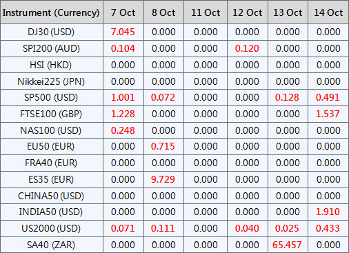 Please be advised that the dividends of the following index CFDs will be adjusted by upcoming ex-dividend dates. The comment for trading index CFDs will be in the following format “Div&<Product Name>&<Net Volume>” which show in the balance after the close of the day before the dividend payment date.