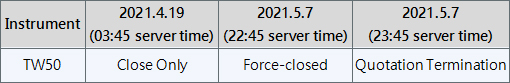 Please be advised that Pacific Union will terminate offering the product of TW50 Index Cash from 7th May 2021 because of the changes made by our Liquidity Provider. Therefore, the status of TW50 will be set to“Close Only”on 19th April 2021, and all open positions will be force-closed one hour before market close on 7th May 2021.