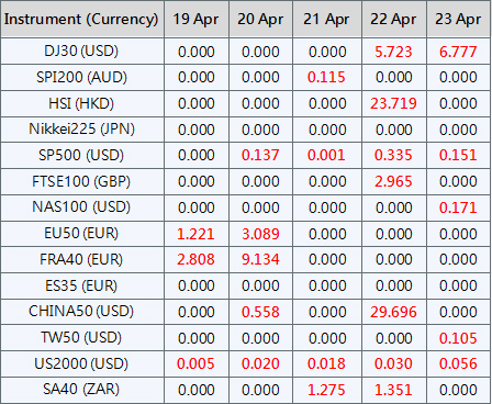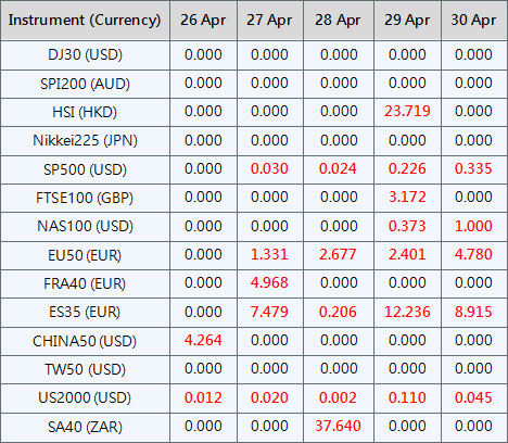 Please be advised that the dividends of the following index CFDs will be adjusted by upcoming ex-dividend dates. The comment for trading index CFDs will be in the following format “Div&<Product Name>&<Net Volume>” which show in the balance after the close of the day before the dividend payment date.