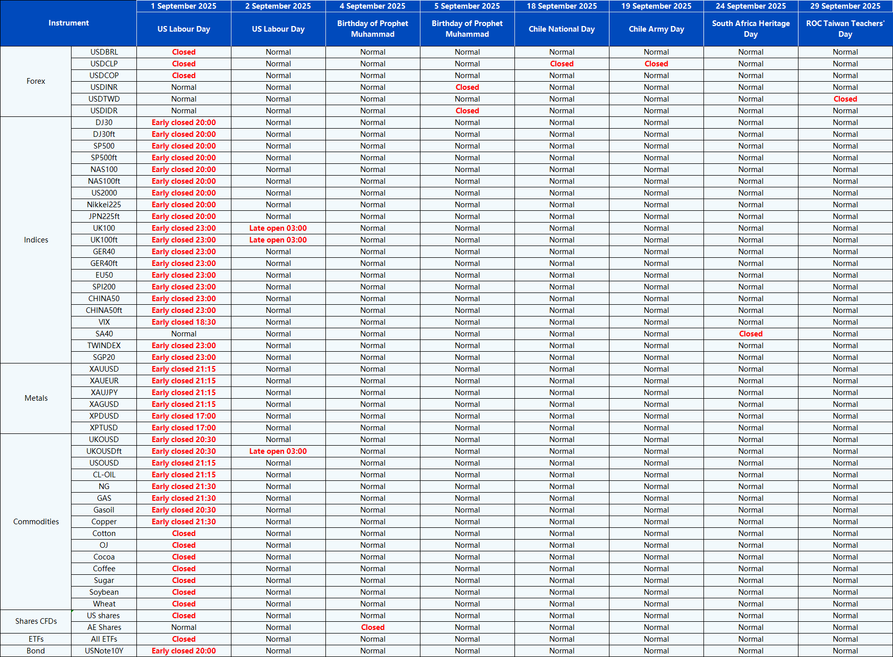 Please be advised that the following instruments’ trading hours and market session times will be affected by the upcoming September holidays.