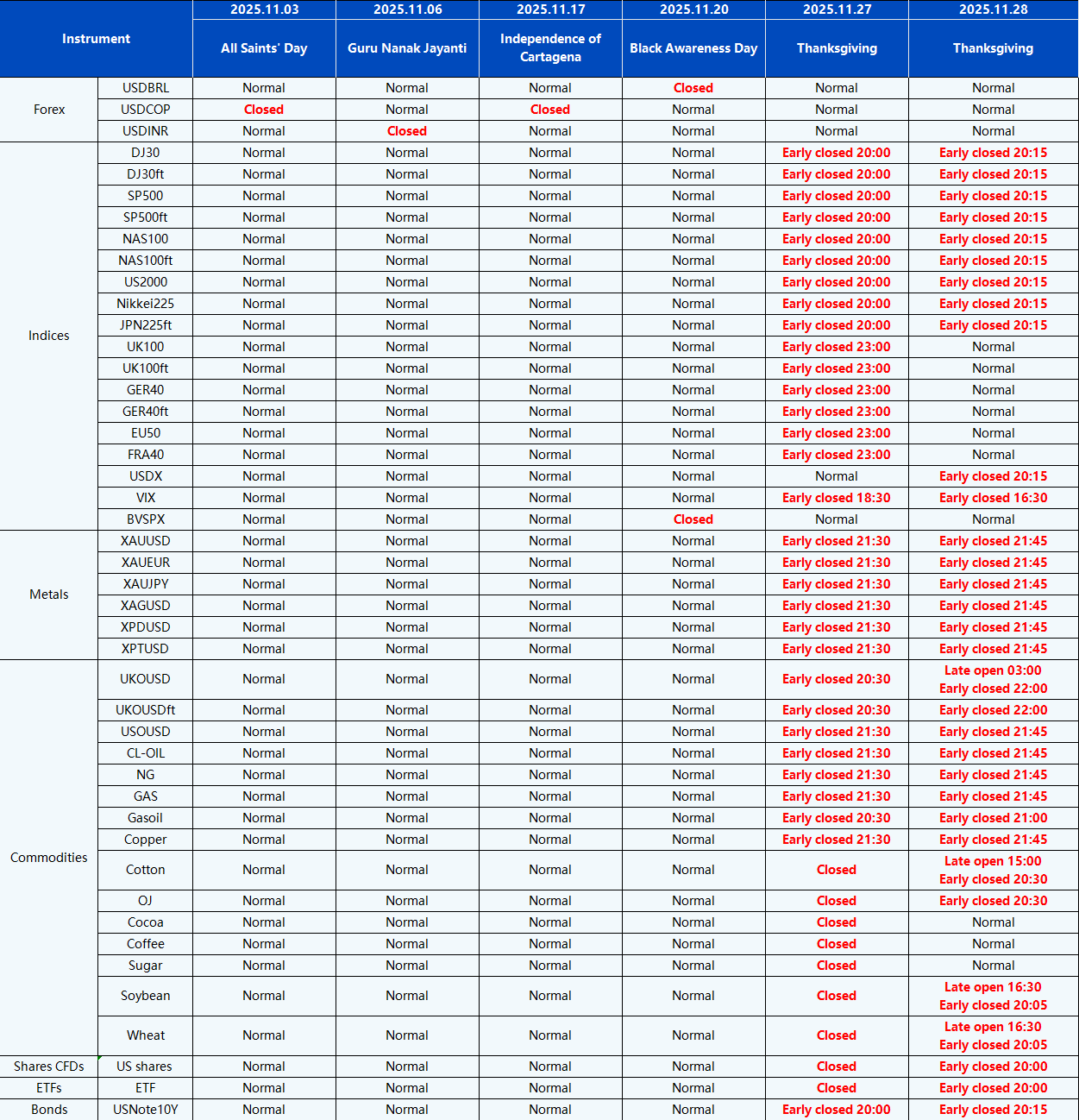 Please be advised that the following instruments’ trading hours and market session times will be affected by the upcoming November holidays.
