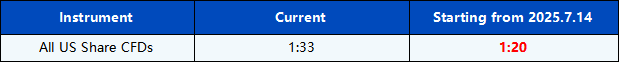 Please be advised that the leverage on all US Share CFDs products will be adjusted from 14 July 2025 to further optimise the competitiveness and improve the trading environment.