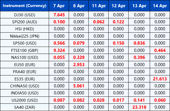 Please note that the above data are subject to changes. Please refer to MT4/MT5 for details.