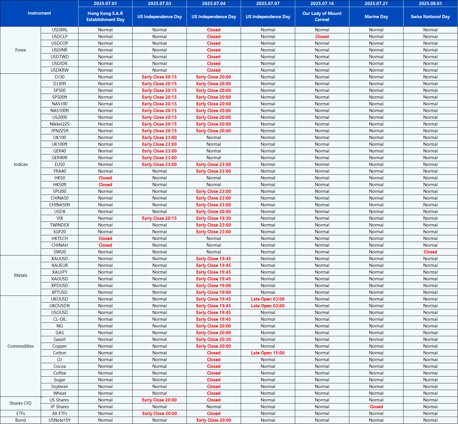 Please be advised that the following instruments’ trading hours and market session times will be affected by the upcoming July holidays.
